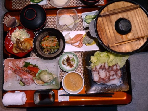 締めは「民宿 宗谷岬」の夕食です。ネットでは、このタコのシャブシャブが大好評のようです。右下に見えるのが、薄切りにしたタコです。このあたりでは、タコが沢山取れるのですね。海の幸、満タンです。
