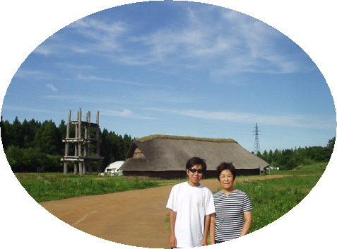 有名な大型掘立柱建物跡を背景に |