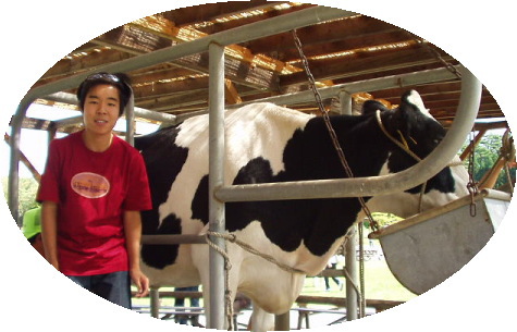 乳搾りを体験する拓磨。ちなみに拓は丑年でした。