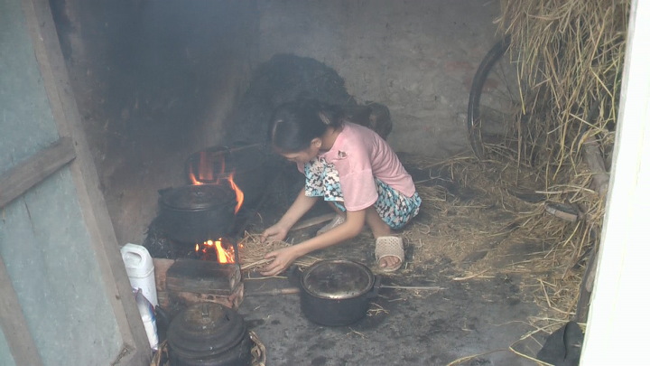 母親の唯一の手足となって働いている次女。 私たちが家に来た時、彼女はこんなところで わらを燃やして煮炊きをしていました。 |