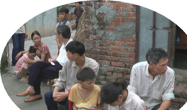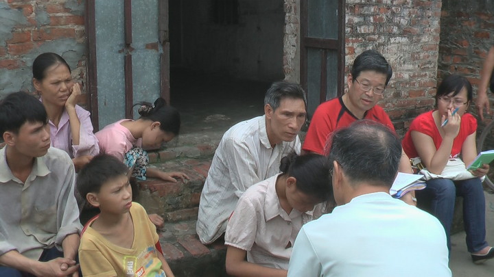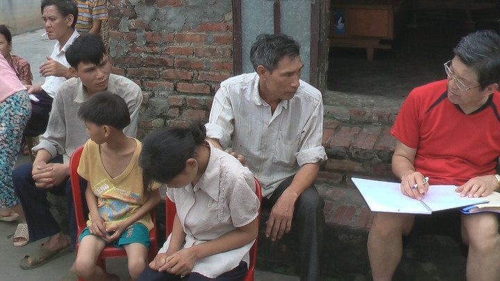 北村 元さんに家庭状況について説明する父親 枯れ葉剤の影響で体調を崩し働くことができません その前で、ずっとうつむいたままの長女。 その左隣の次男は視力は正常そうですが、知的障害があるとのこと さらにその後ろの長男は重度の視覚障害でほとんど見えないとのことでした。 |